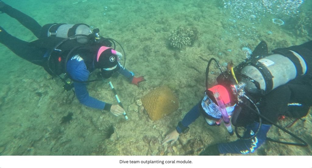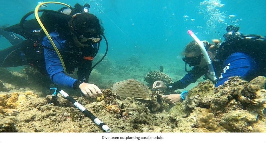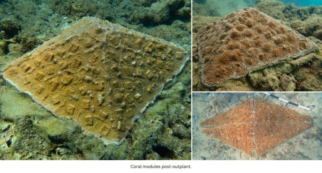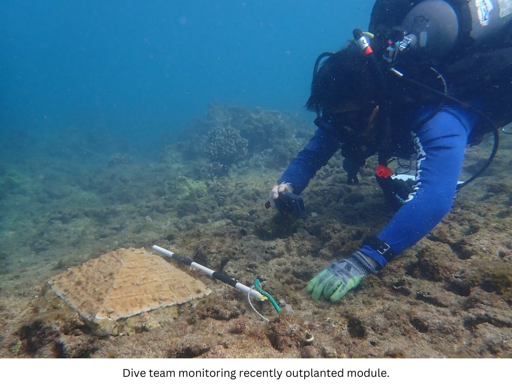 During the baseline assessment, natural corals growing adjacent to the outplanting site are selected as reference control corals. These control corals are used to compare coral health and growth between areas containing naturally occurring coral colonies and outplanted modules to analyze long-term restoration outcomes. Over time, the outplanted coral will begin to blend into the natural environment, both in terms of color as well as profile appearance.