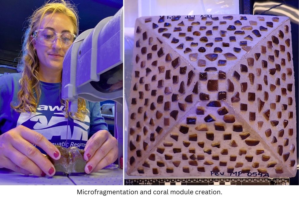 HCRN staff use a specially-designed diamond blade band saw to cut a coral colony into 1 cm x 1 cm square pieces (microfragments) which creates more edges for new tissue growth and increases the surface area to volume ratio. If a 10 cm x 1 cm coral is cut into 100 microfragments, each 1 cm x 1 cm, the coral now has a total perimeter of 400 cm for new tissue growth to occur. After the coral is microfragmented, coral-safe superglue is used to attach fragments onto cured concrete pyramid modules made at the nursery.