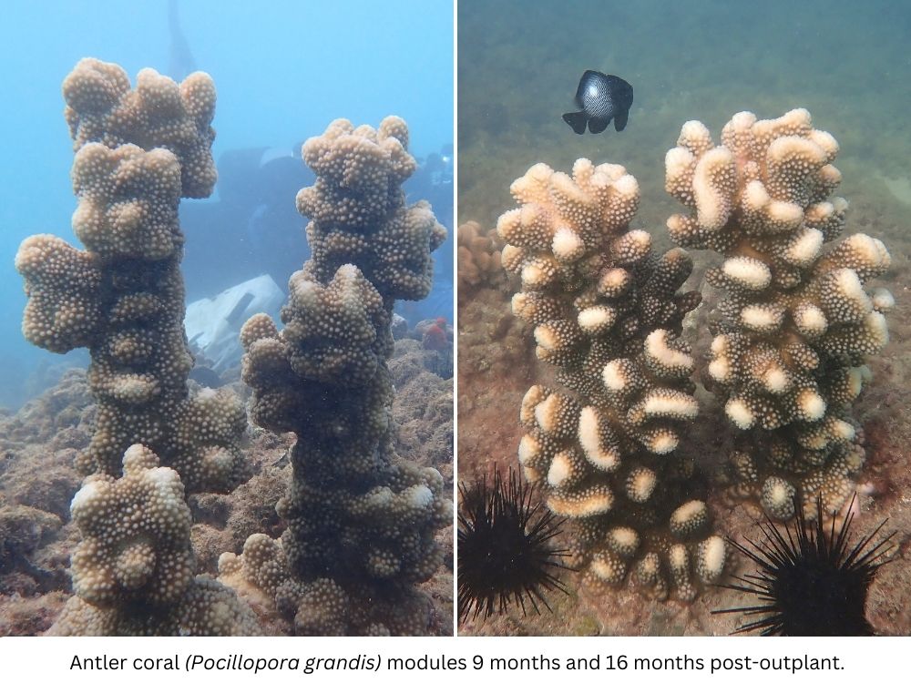 - Size and growth of the outplant, including new coral growth