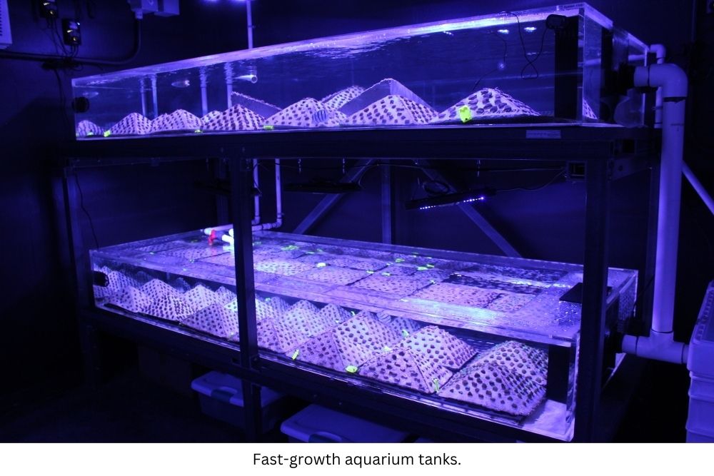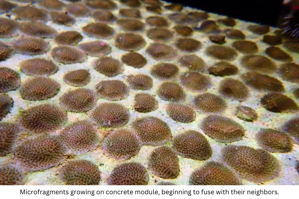 The coral module is placed in a specialized aquarium (“grow-out tanks”) to complete the fast-growth process. Using these concrete modules as a base, microfragments have an initial surface they can grow onto. All the microfragments on the module are from the same source material (i.e. the same genotype), so as they grow across the surface of the concrete module and meet up with their neighboring microfragments, they will fuse to form one large adult colony.