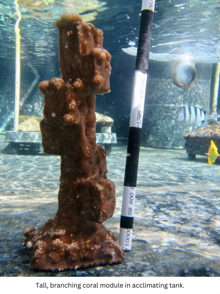 The most common Hawaiian coral growth forms are massive (mounding), plating, or small branching colonies. Other reefs in the world are dominated by branching corals. To preserve the ecosystem functions of large bouldering or plating coral, the HCRN uses specially designed modules to mimic natural coral structures while minimizing potential damage from waves and sediment.