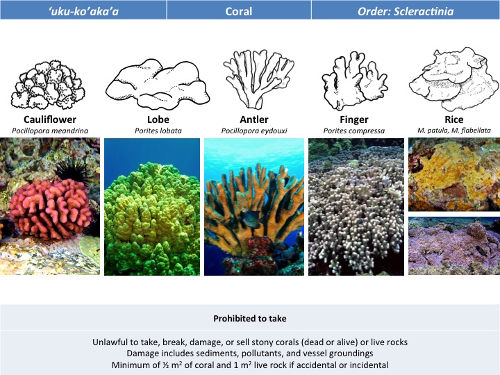Unlawful to take, break or damage, any stony coral, including any reef or mushroom coral. Unlawful to damage any stony coral by any intentional or negligent activity causing the introduction of sediment, biological contaminants, or pollution into state waters. Unlawful to sell or offer for sale any stony coral, except that stony coral rubble pieces or fragments imported for the manufacture and sale of coral jewelry, or dead stony coral obtained through legal dredging operations in Hawaii, may be sold. HAR 13-95Slide063