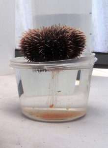 After approximately 4-5 months the urchins are large enough (about the size of a quarter) to be handled and transplanted to their new homes on the reef. Once released, they quickly go into hiding. Juvenile urchins munch away on the invasive algae, and soon grow too large to hide in holes on the reef. Eventually, the urchins emerge and spend the rest of their days slowly moving across the reef in search of their next meal.