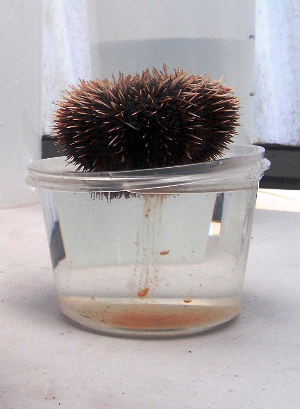 Once a month, divers collect approximately 20 wild adult urchins from various locations across the south shore of O‘ahu. Once collected, they are returned to Ānuenue Fisheries Research Center where staff eagerly await their arrival. Staff then gently agitate the urchins to get them to spawn and release their gametes into plastic containers.