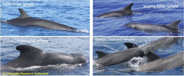 Above water, dorsal fin shots of the false killer whale, the pygmy killer whale, the short-finned pilot whale, and the melon-headed whale.