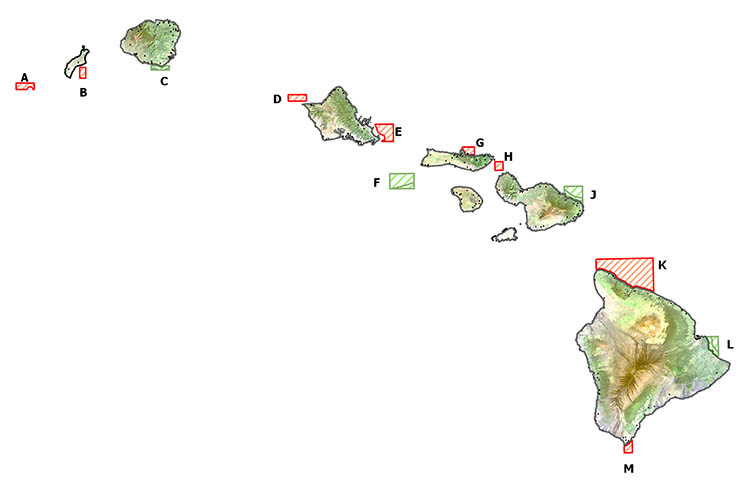 Four of the 12 Bottomfish Restricted Fishing Areas (BRFAs) around the state are scheduled to re-open to Deep-7 bottomfish fishing on July 1, 2019. They include BRFA C (Makahū‘ena, Kaua‘i), BRFA F (Penguin Banks), BRFA J (Mokumana-Umalei Pt, Maui), and BRFA L (Leleiwi Pt, Hawai‘i Island). (See map.)