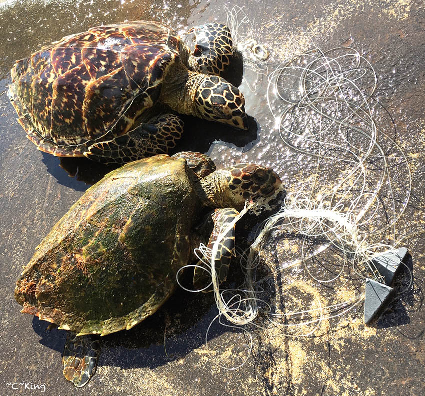The foraging and diving behavior of sea turtles makes them particularly vulnerable to entanglement in debris or discarded fishing gear. Young turtles utilize floating objects for food or shelter and may accidentally become entrapped. Marine turtles often use oceanic fronts and currents to move through the waters where debris congregates, thus increasing potential entanglement risk. In particular, debris such as fishing lines, hooks, and nets pose the greatest risk as these objects can wrap around the animal’s appendages and prohibit them from surfacing to breathe, swim effectively, avoid predators, eat, or reproduce. Sea turtles of a variety of species have also been shown to consume plastics in Hawaiian waters. Visit our Fishing around Protected Species webpage to learn how to fish around Hawai‘i’s protected species properly. Also please report marine debris at sea or on land to Hawai‘i’s marine debris hotline at 833-4-da-NETS (833-432-6387) or utilize DLNR’s online reporting form.