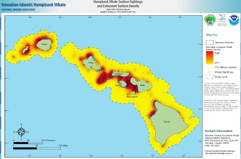 Research in Hawai`i has found that humpback whales are most frequently found in waters with a depth of 100 fathoms or less (Mobley & Herman, 1999), as seen in the estimated density for humpback whales throughout the main Hawaiian Islands below.