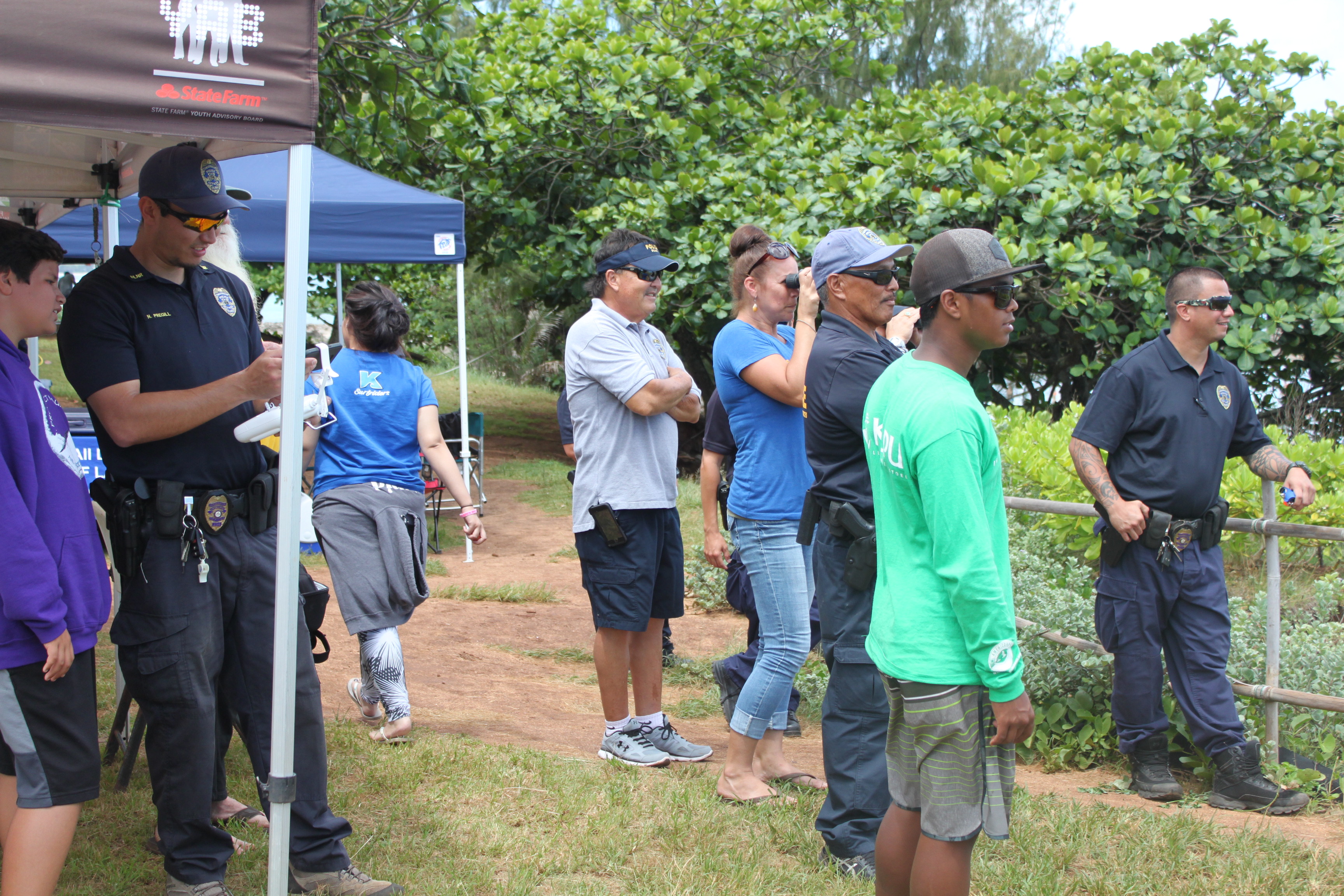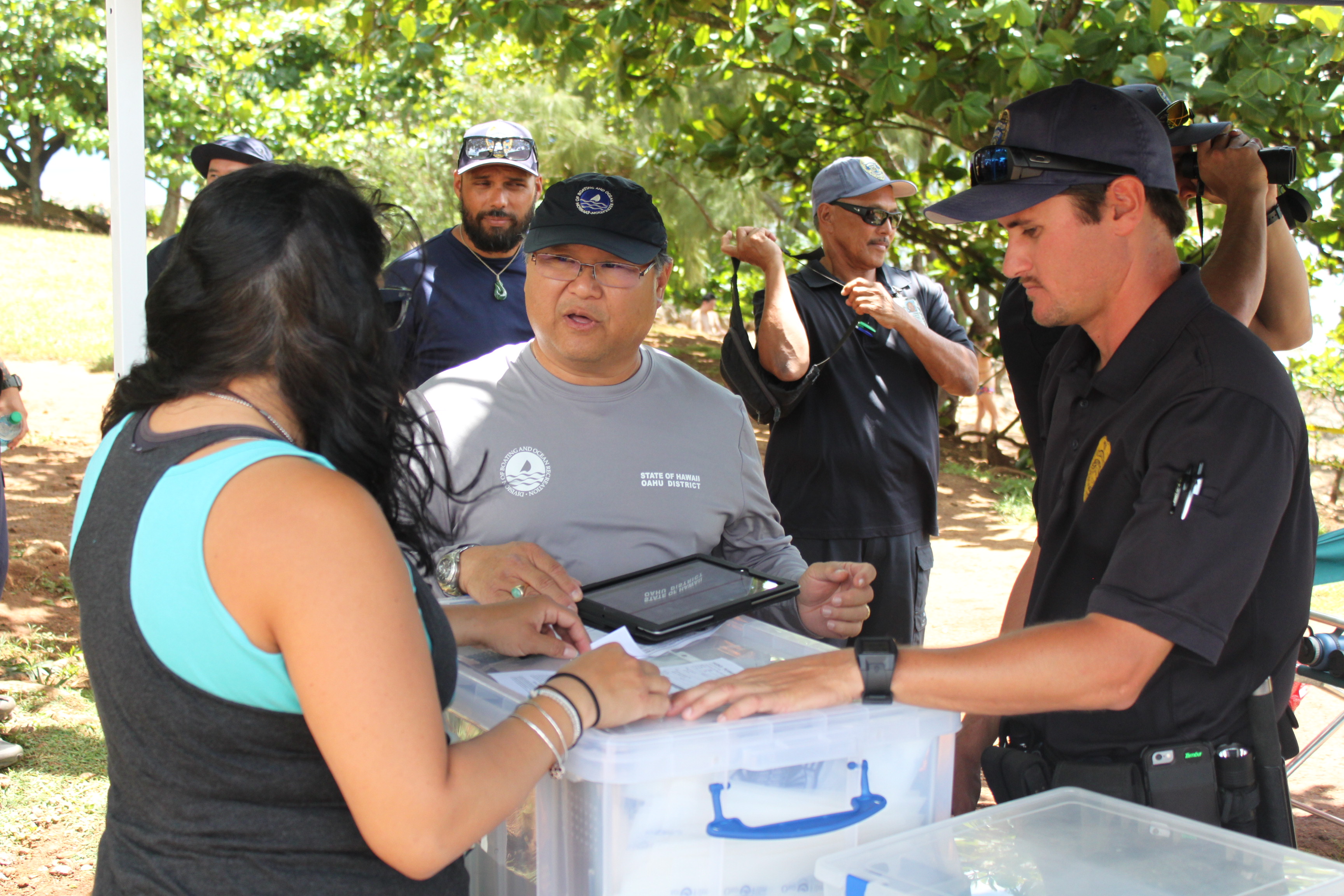 (HONOLULU) – Two DLNR Divisions and the Mālama Pūpūkea -Waimea Makai Watch program teamed up over the weekend for the first “Splash” event, created to continue support and evaluation of the Makai Watch program, provide education on rules and regulations, and also address people’s perceptions about the DLNR Division of Conservation and Resources Enforcement (DOCARE) in our local communities.DOCARE-and-Waimea-Makai-Watch