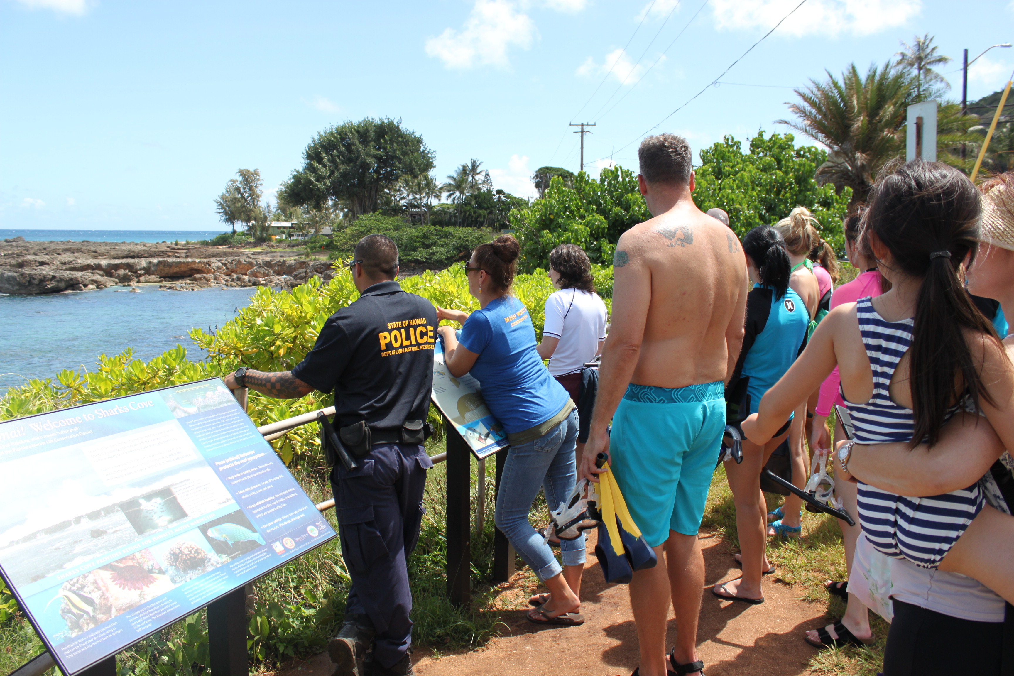 Rolling in traffic on the north shore of Oahu passing “Pūpūkea” (Sharks Cove), a line of parked DOCARE vehicles could be DOCARE-and-DOBOR-Makai-Watch-Beach-Goersseen Saturday morning.  A closer look towards the ocean, and a mix of DOCARE officers, the DLNR Division of Boating and Ocean Recreation (DOBOR) Education Specialist, and Makai Watch volunteers could be seen interacting with and engaging beach-goers with proper reef etiquette and beach safety.