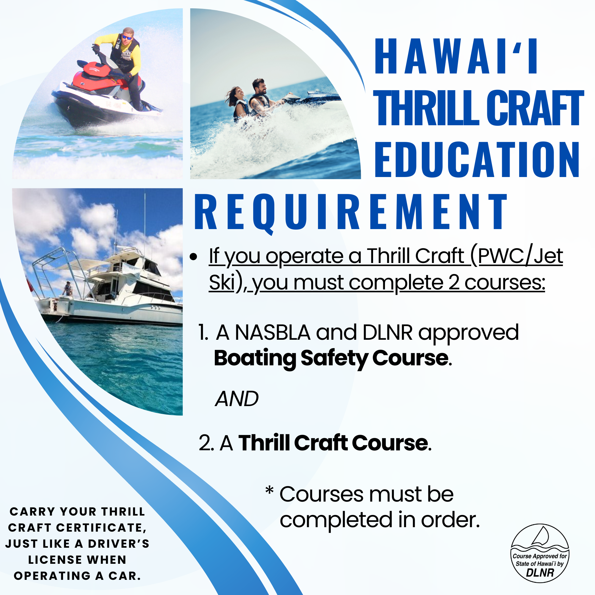 To operate a thrill craft (PWC/ Jet Ski) in Hawaiʻi, you must have two credentials: (1) a NASBLA- and State-approved boating education course for motorized vessels, and (2) a Thrill Craft Operator Certification under HAR §13-256-16. This rule has been in effect since 2005 to improve safety and reduce user conflicts. The text of this rule is contained in Hawaii Administrative Rule Section §13-256-16 (available here).