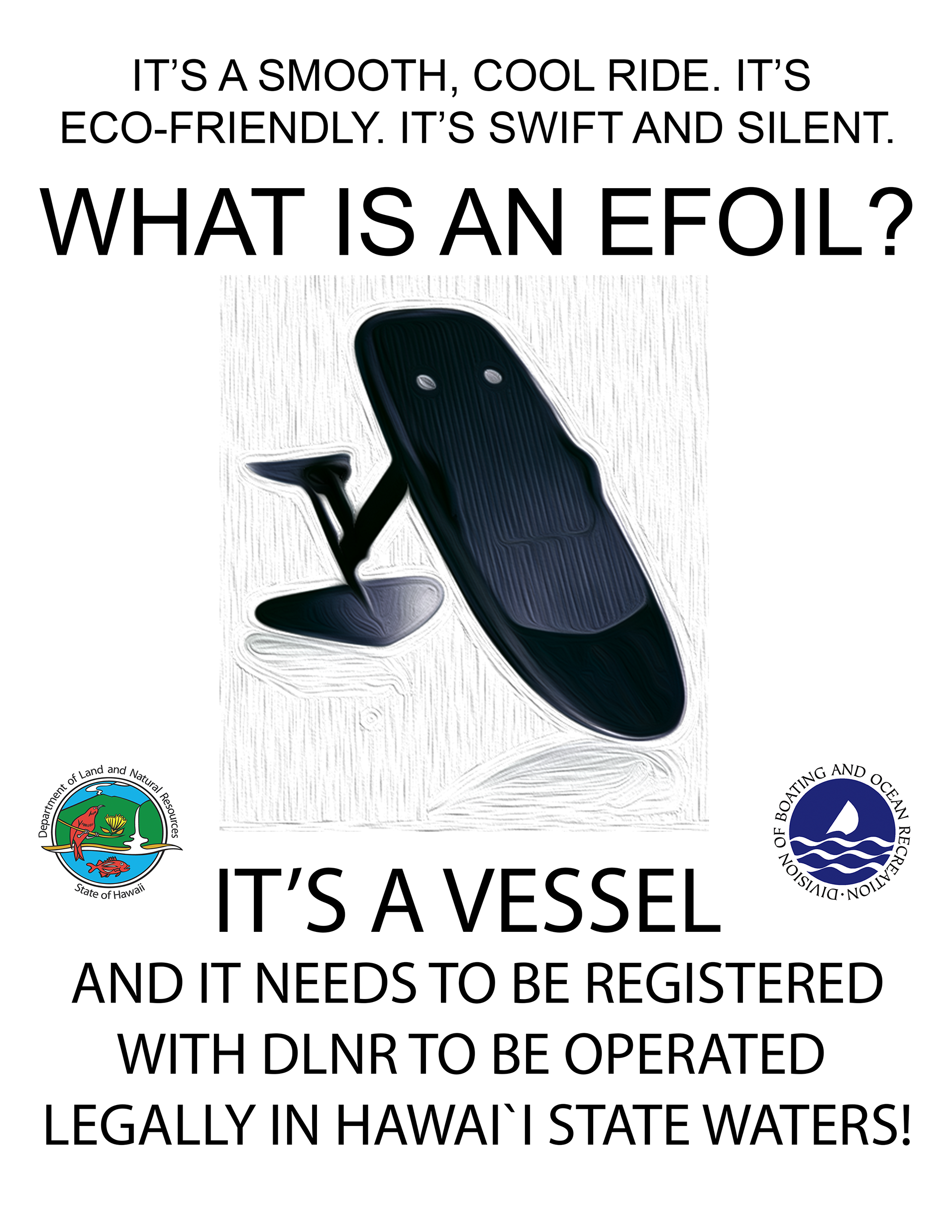 Boating safety education is required if the power rating of a motorized vessel is 10HP (7.457KW) or more. Even if your e-foil’s power rating is under this threshold, DOBOR highly recommends completing a course to get an understanding of boating laws, rules, and practices. Information about DLNR-approved boating safety courses is available at DOBOR’s Mandatory Education Page.