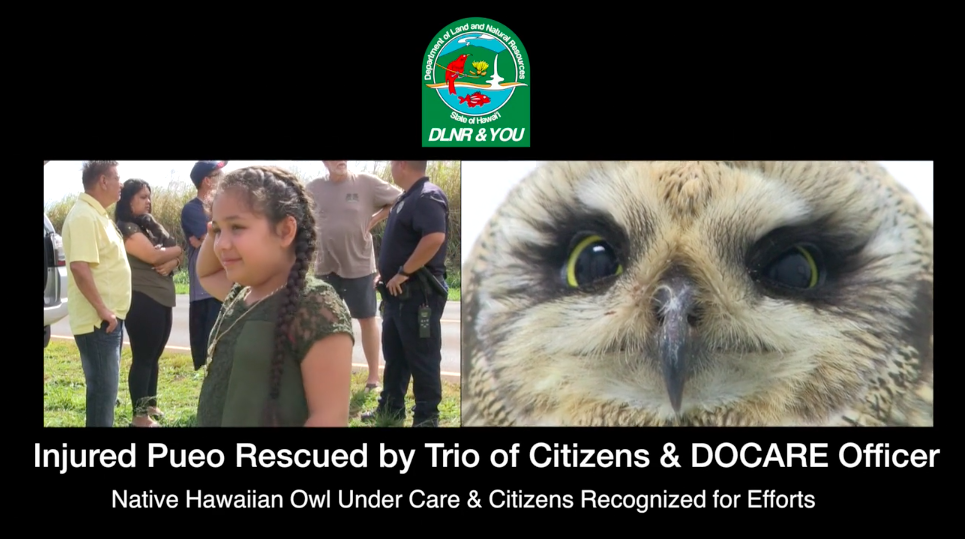 (HONOLULU) – When 7-year-old Malia Rillamas first spotted the bird, she pointed it out to her dad Jonathan. The family, from Haleiwa, pulled off the country road on O‘ahu’s north shore on the afternoon of Jan. 15, 2017 to see if they could help. A short time later Brian Smith of Wahiawa also pulled over. Together the trio watched as the pueo (Hawaiian short-eared owl), hopped across the road and ultimately into a deep roadside ditch. They discussed what to do and who to call and eventually called 9-1-1 which put them in touch with the DLNR Division of Conservation and Resources Enforcement (DOCARE).