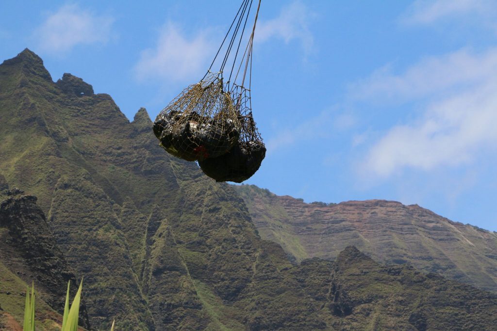 DOCARE officers arrested six people for closed-area violations.  They also eradicated eight young marijuana plants from an abandoned campsite.  Squatters have also established elaborate gardens where they’re growing bananas, papaya, taro and other fruits.  Officers provided support for a State Parks maintenance team, which removed 15 large illegal camps, plus additional smaller ones and gear stashes. Two and a half tons of rubbish was airlifted by a helicopter in 15 sling loads. Seven State Parks staff and between six and twelve DOCARE officers were involved daily during last week’s operation.