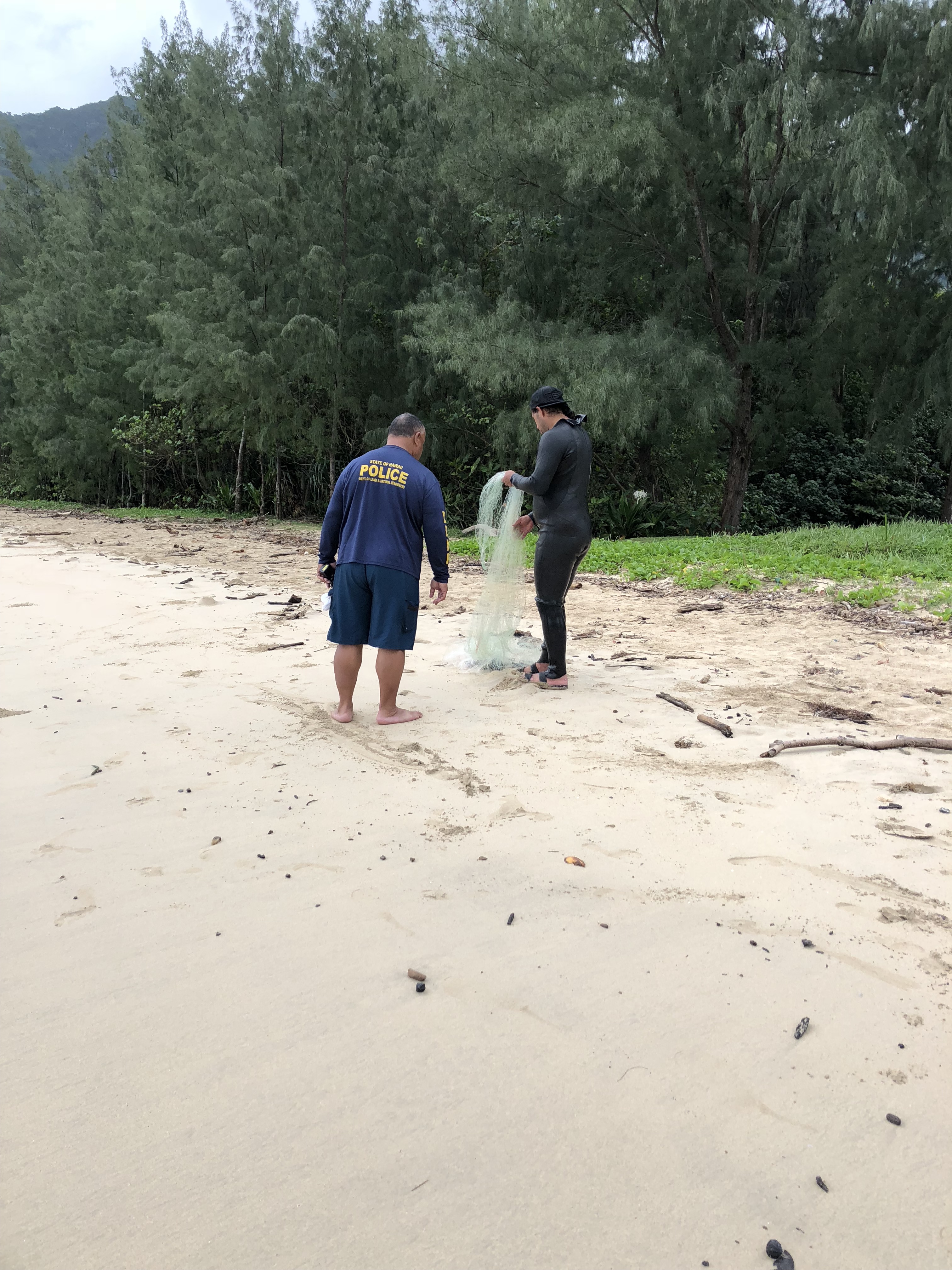 After the officer’s investigation, they cited two men for taking ‘ama‘ama out of season, and for possessing and using unregistered laynets. The nets and boats were seized for evidence and depending on the outcome of legal action against the pair, confiscated items might not be returned.
