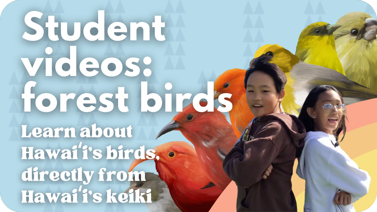 Showcase: Makahiki o Nā Manu Nahele (Year of the Forest Birds): Twenty-four student groups across Hawaiʻi submitted videos to our 2024 contest for Makahiki o Nā Manu Nahele, the Year of the Forest Birds. Elementary, middle, and high school students used homemade bird puppets, original animations, moʻolelo, and other tools to share their thoughts about the importance of Hawaiian forest birds. Learn about our manu and the threats they face, directly from Hawaiʻi’s keiki.