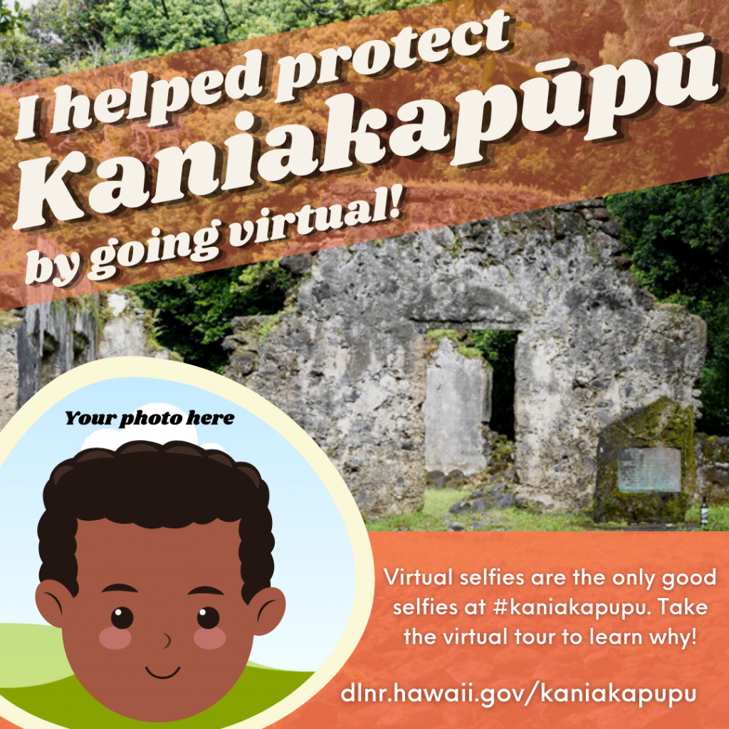 If you’d like, you can also share an image on social media. Putting these images on social media with the hashtag #kaniakapupu is a great way to educate social media photographers who may otherwise only see photos of people visiting illegally and think that they can do the same. You can download and share the image on the left, or you can click on the image on the right to create a virtual selfie using our template at Canva.com. Once you’re on Canva, you can upload a photo of yourself and into the photo frame. DLNR won’t have access to your uploaded photo; your custom design is yours to download and then share with friends via social media. Mahalo!