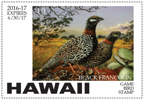 Mahalo and have a great 2016-17 Hunting Season. The new 2016-17 Conservation and Game Birds Stamps will be available on June 15th 2016 for the new hunting season.