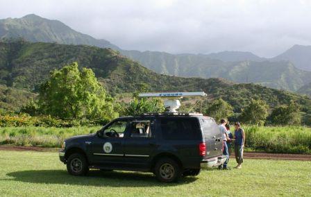 Two radar trucks (one white, one red) will be used again at 18 standard sites along Kaumualii and Kuhio Highways and some County roads around the island. The sites were selected based on areas where endangered seabirds are known to move between the sea and montane breeding grounds. The radar surveys are conducted at night because both species are nocturnal (active at night). Radar monitoring is carried out during the first two hours after dark – when birds return from the sea, and two hours before dawn – when seabirds head back out to sea. The radar trucks remain stationary for the entire night and return to home base in the morning.