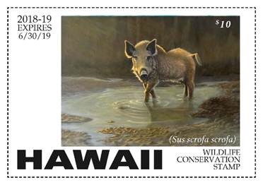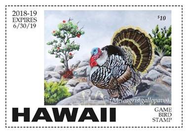 The conservation stamp is required on the Hawai‘i State hunting license, and the game bird hunting stamp is required for those intending to hunt game birds. Both stamps (differing slightly in text) will be available to wildlife stamp collectors by calling (808) 587-0166 or visit the Division of Forestry and Wildlife office located at 1151 Punchbowl Street, Room 325 Honolulu, HI 96813