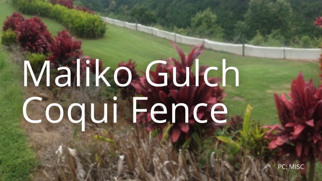 Forestry and Wildlife is working with the Maui Invasive Species Committee to install a coqui frog fence around Maliko Gulch. The fence will keep frogs from escaping the gulch as MISC continues its control efforts within the fenced area. Learn more at MISC’s page on coqui frogs.