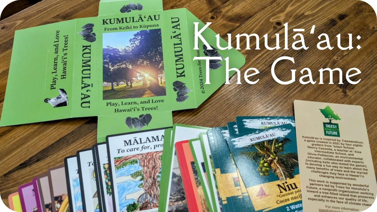 From Trees for Honolulu’s Future, this new card game is about Hawaiʻi’s trees and climate change. Kumulāʻau translates to “tree” in ʻōlelo Hawaiʻi. This game explores Hawaiʻi’s trees, the many benefits they provide, the threats they face due to climate change, and their needs for growth and survival.