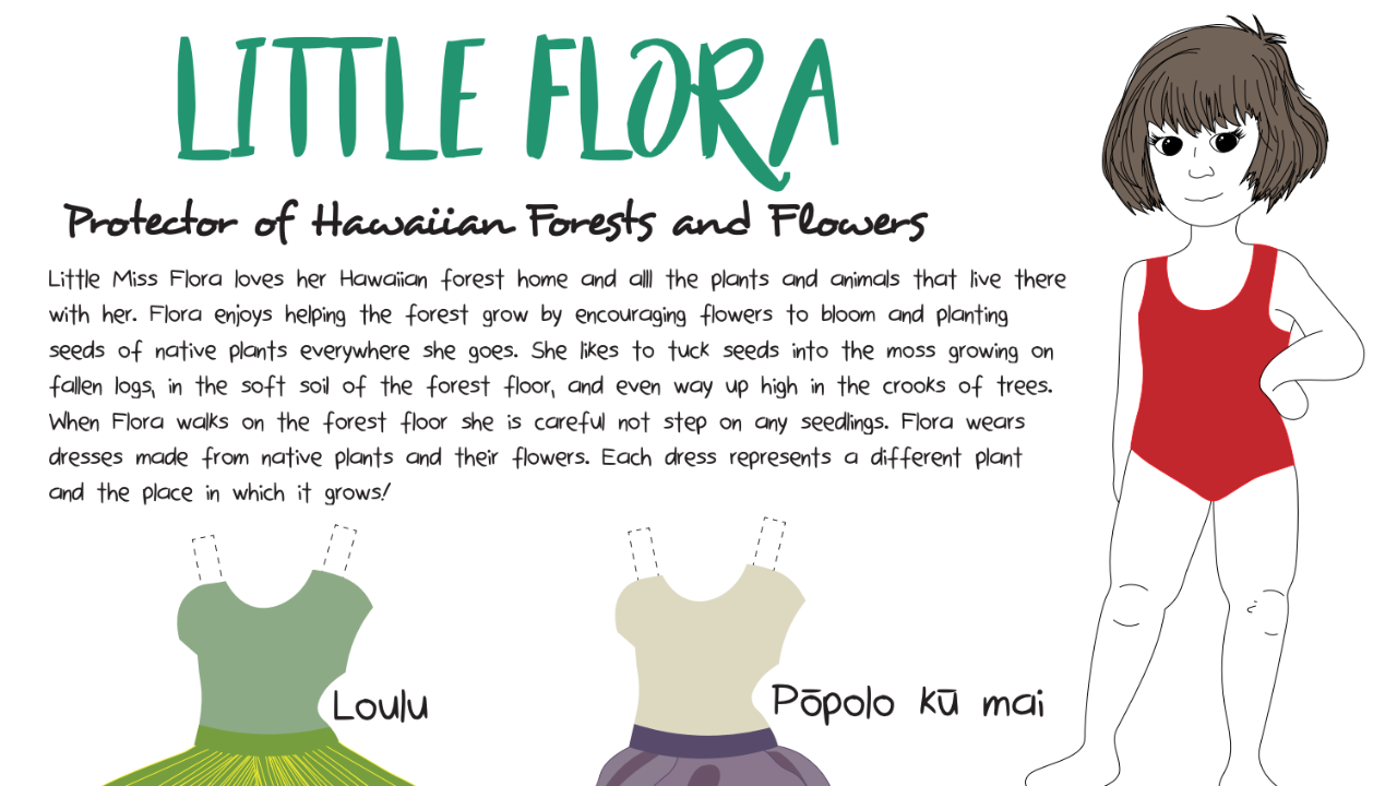 Students can cut out and arrange different native plant parts into outfits for Flora. As part of the activity, make sure to learn about the plants that Flora is wearing through our species profile pages for loulu, pōpolo, koʻoloaʻula, and naupaka kahakai.