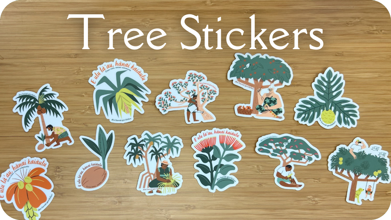 Decorate your water bottle or computer with our stickers celebrating trees and the benefits they provide to communities. We have stickers featuring ʻōhiʻa, wiliwili, monkeypod, kukui, ulu, niu, and activities like carving, weaving, planting, and birdwatching.