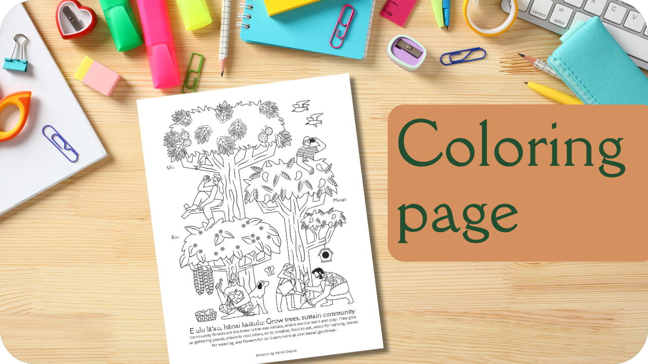 This printable coloring page allows your students to create their own community forest. They can use their imaginations to provide colors for the flowers and fruits of kou, ʻulu, and mango trees, or you can help them explore our website to learn about these species.