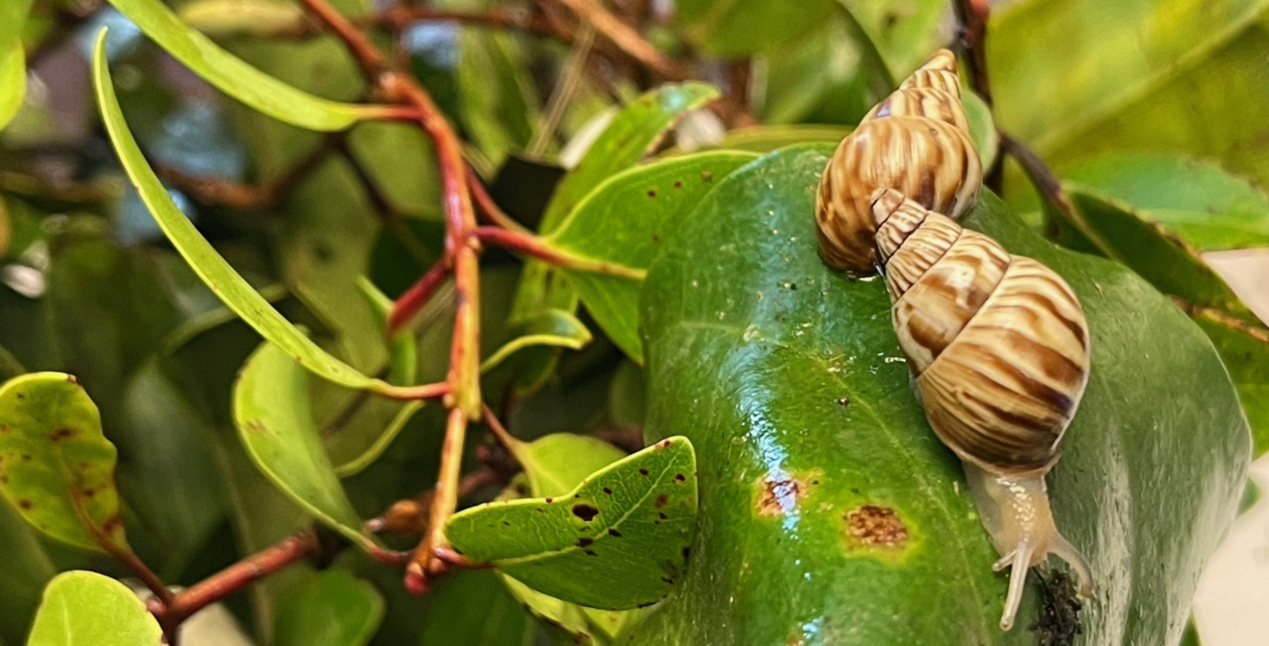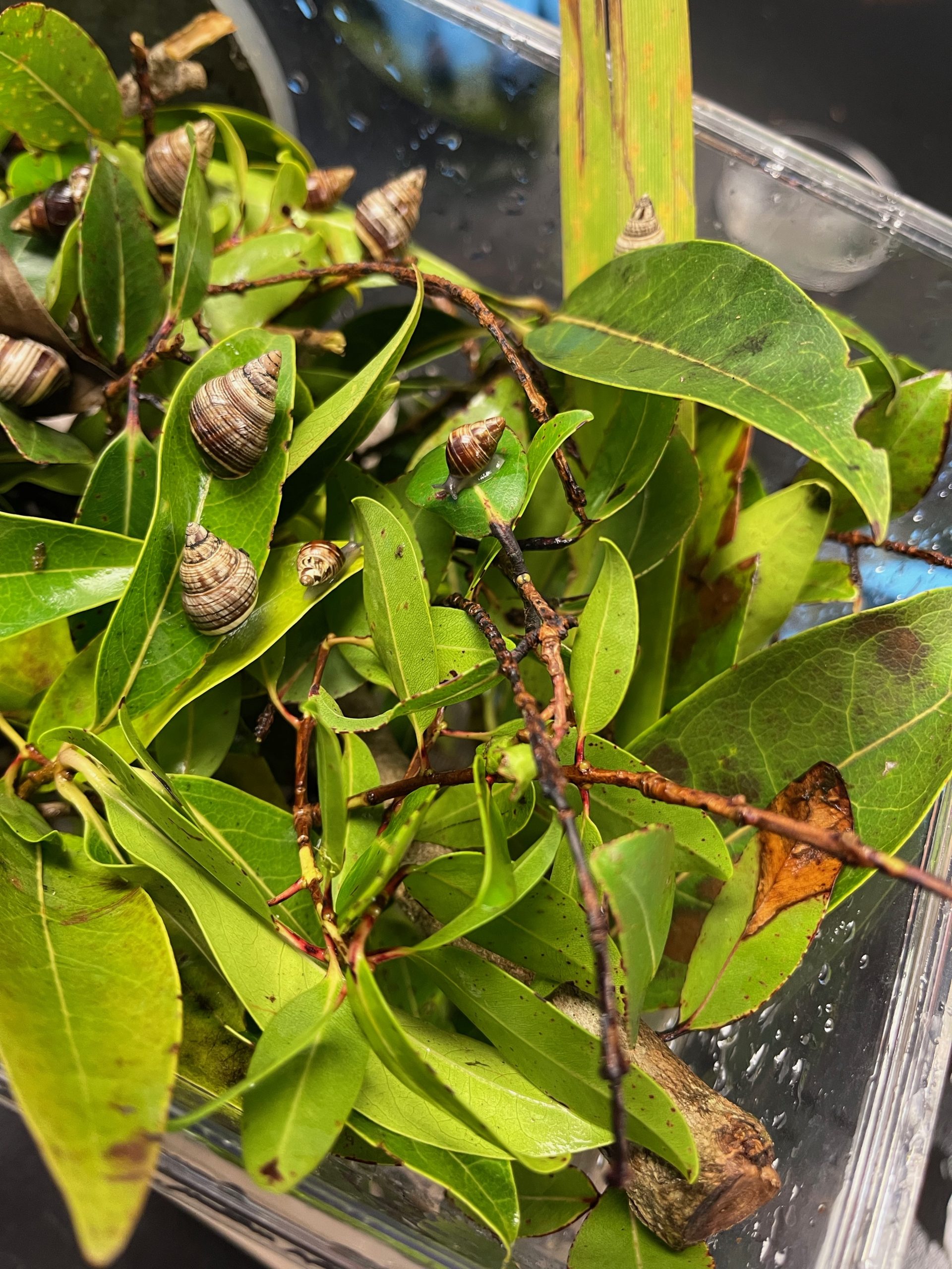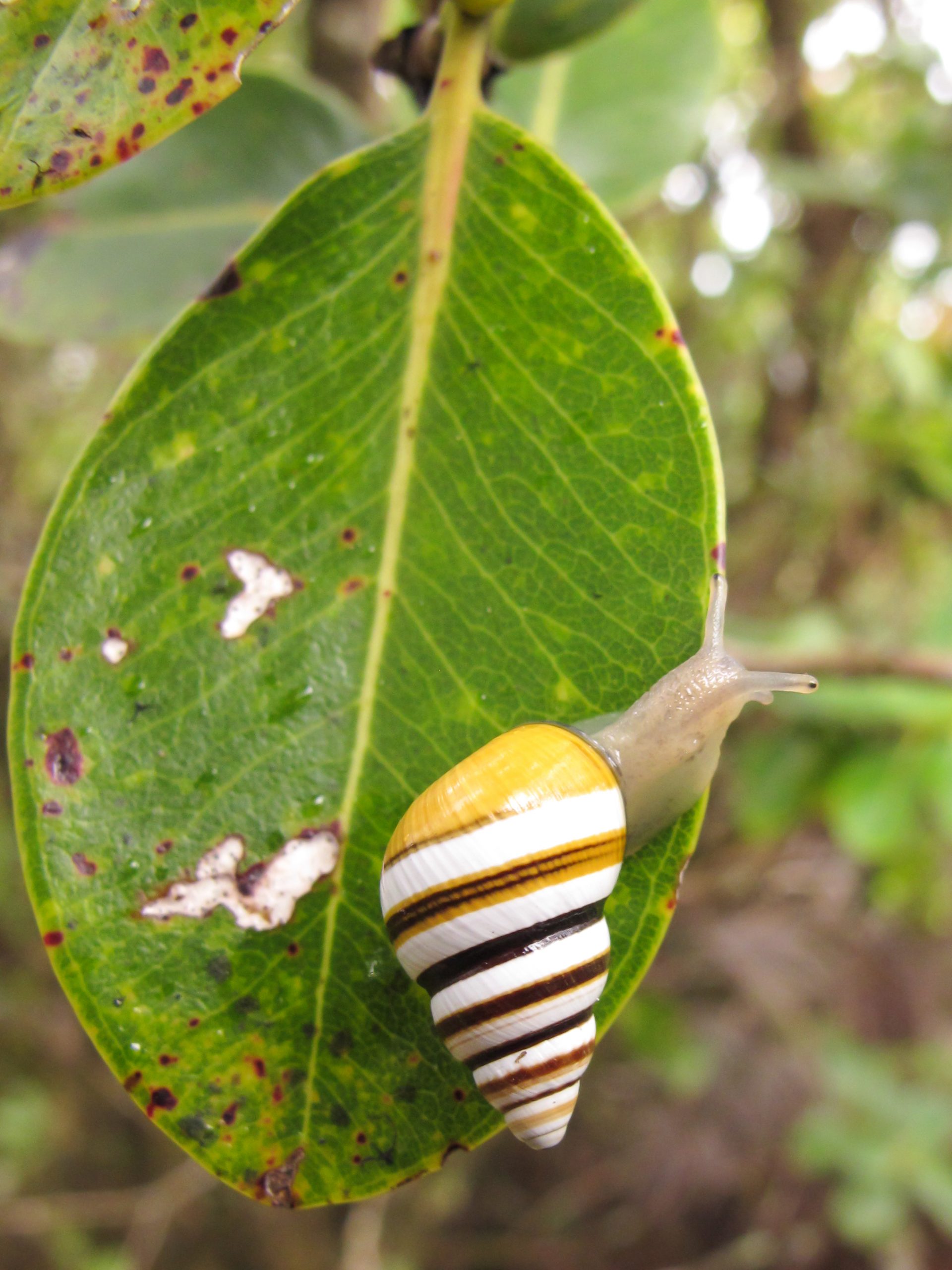 Partulina crocea adult crawling on an ohia leaf. A juvenile Partulina crocea crawling on a leaf.