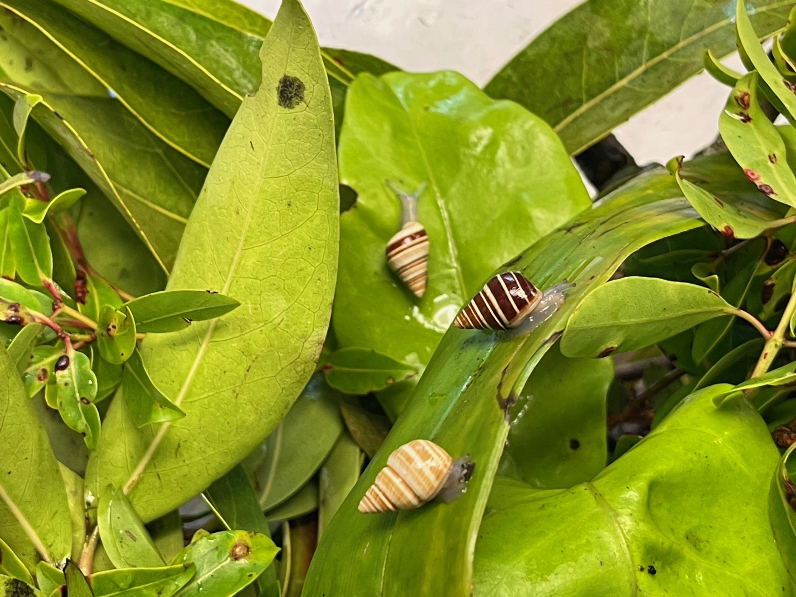 Nine Partulina marmorata adults and sub-adults collected in the field. Partulina marmorata adult on a strawberry guava trunk.