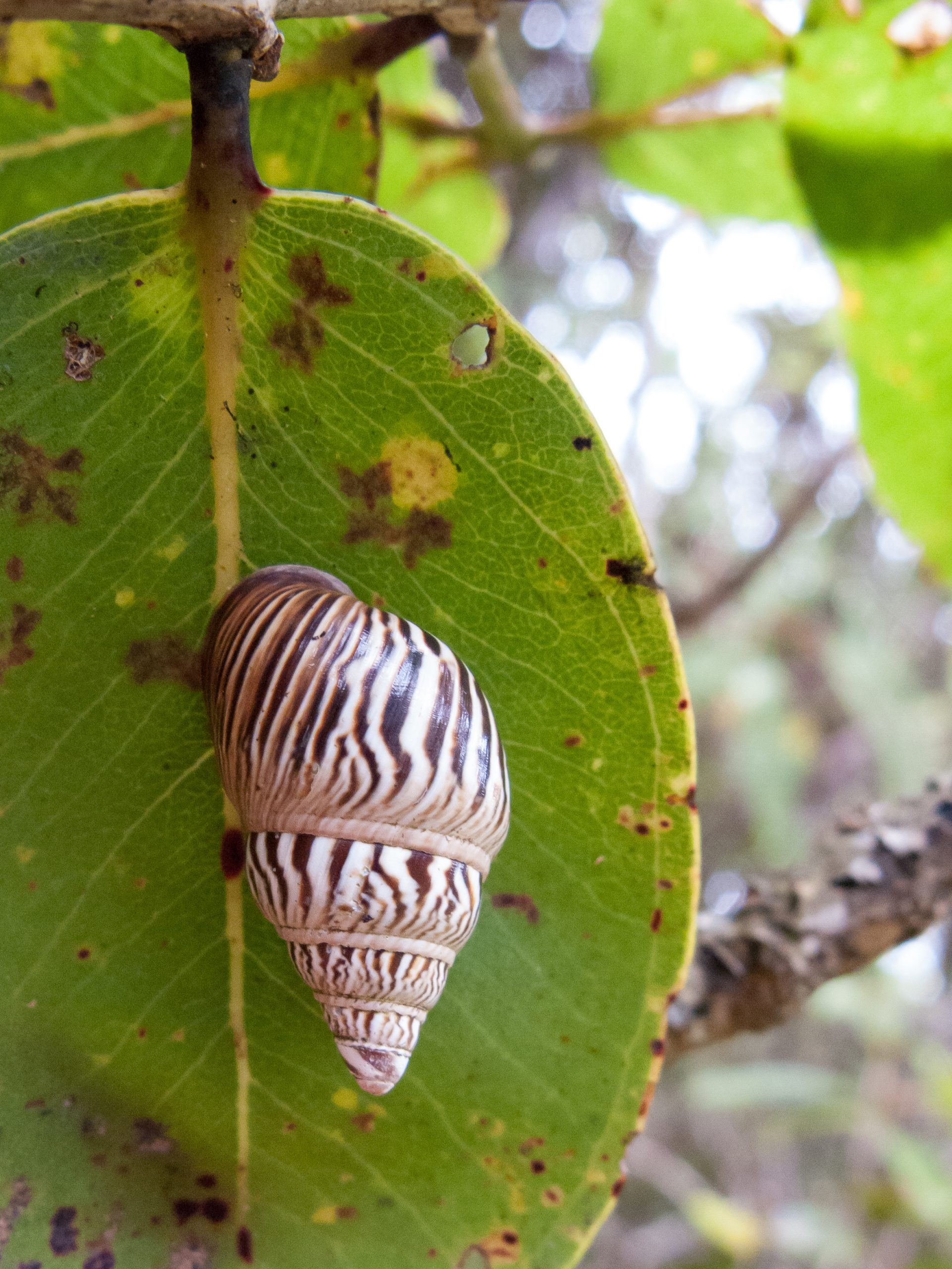 Partulina splendida estivating on an ohia leaf Partulina splendida profile