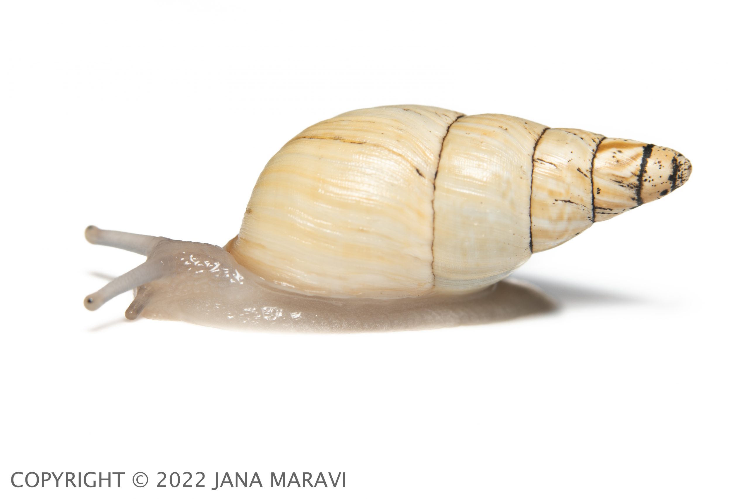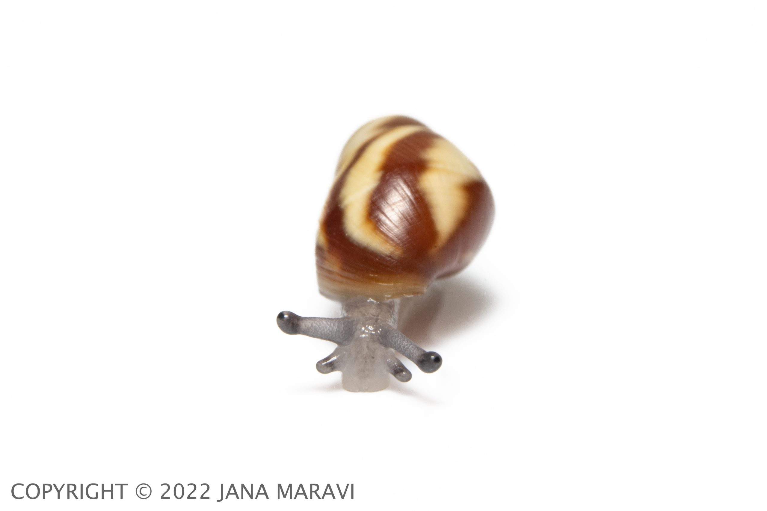 A juvenile Partulina crocea facing the camera. A sub-adult Partulina crocea facing the camera. Birds eye view of an adult Partulina crocea crawling.