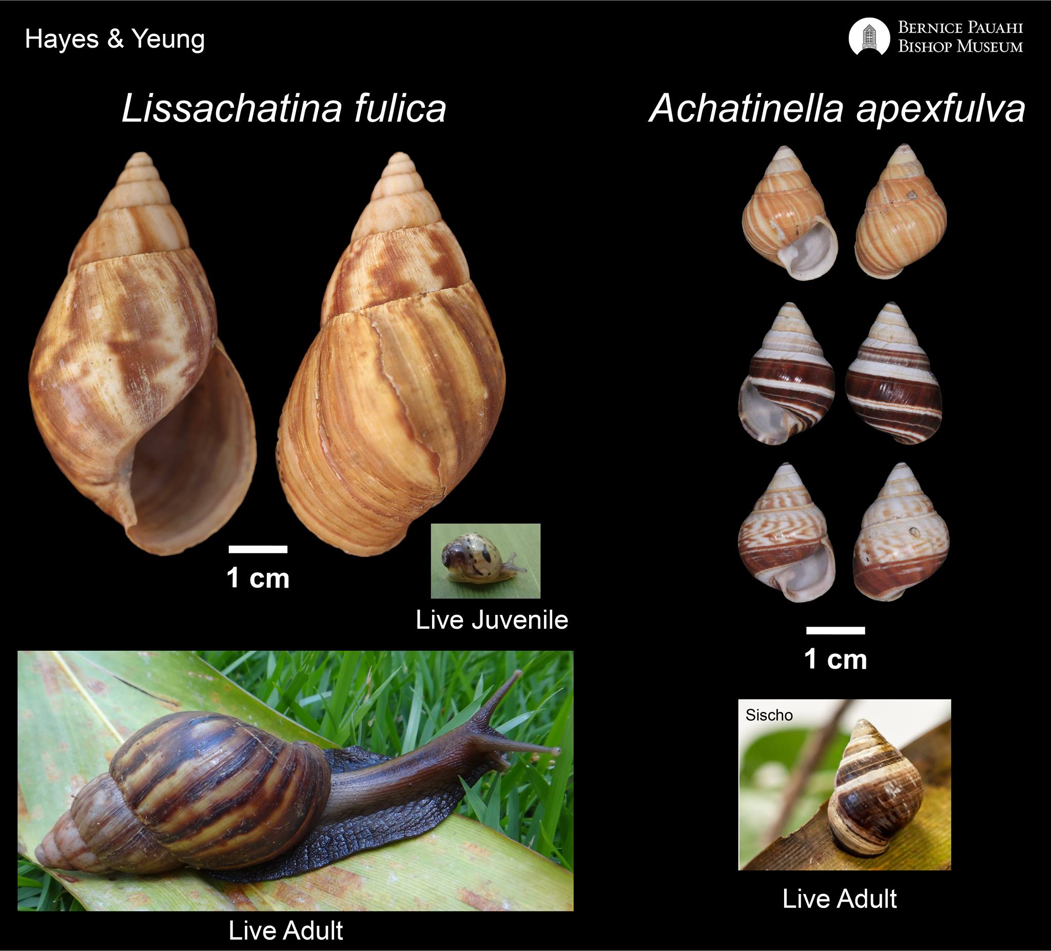 Graphic courtesy of Bishop Museum. Giant African (Lissachatina fulica) snails are often mistaken for native ones but are rather a non-native invasive species. These snails are commonly seen in low elevation and residential areas and do not need to be reported to SEPP. These photos showcase the differences in size and appearance between giant African snails and a SEPP priority species, Achatinella apexfulva.