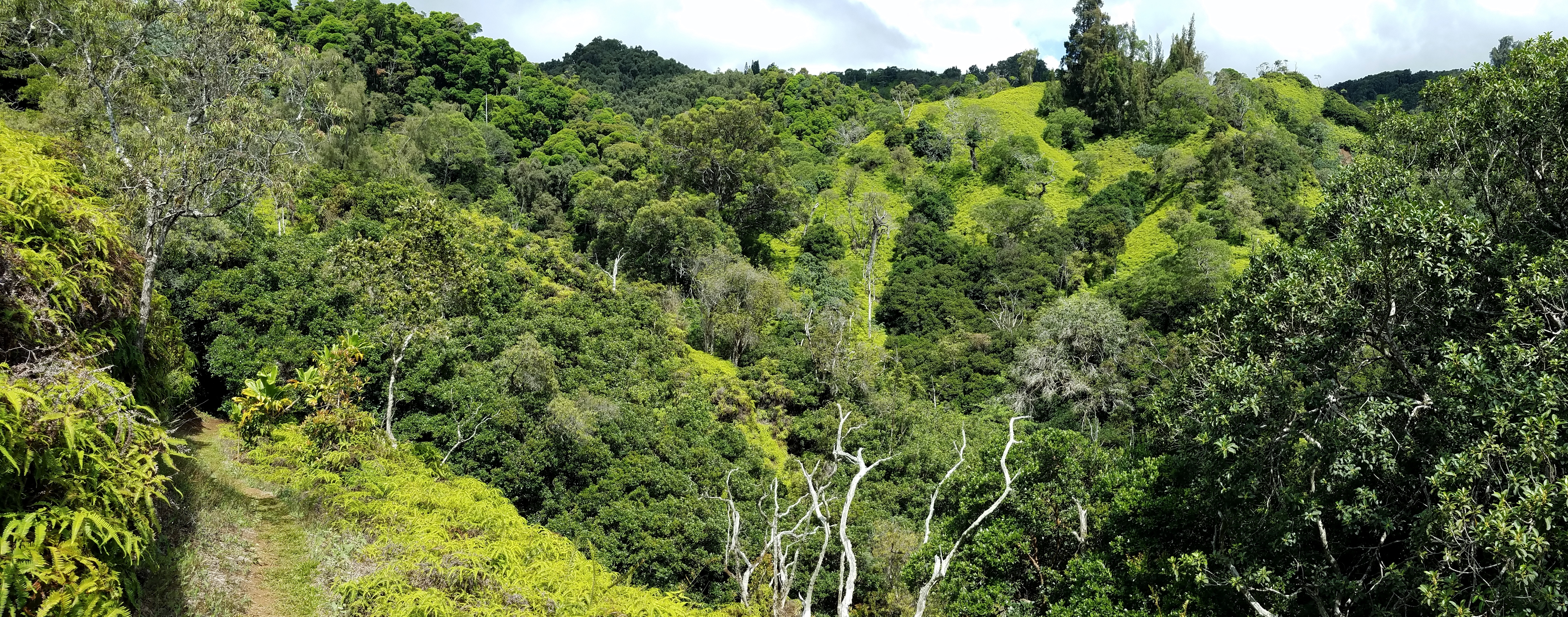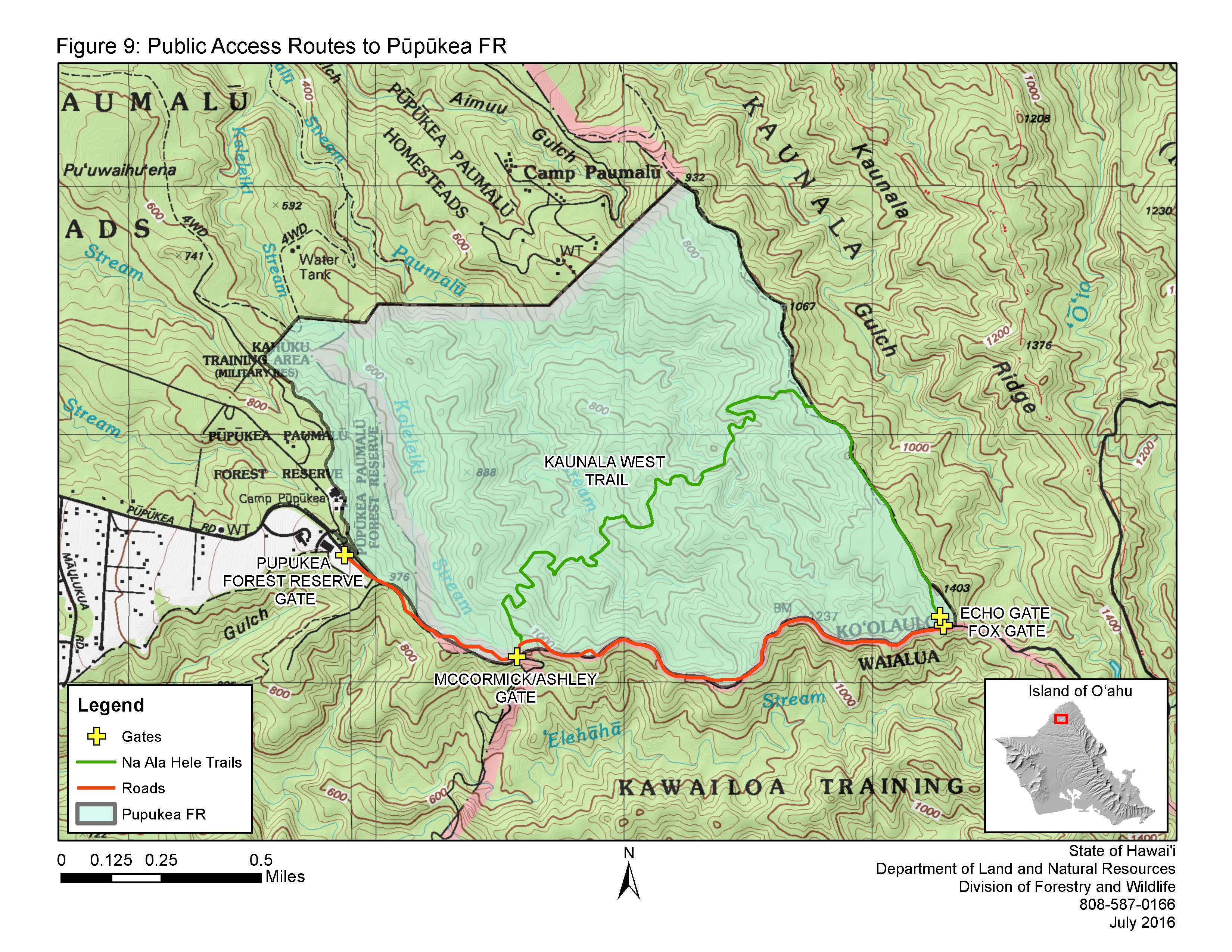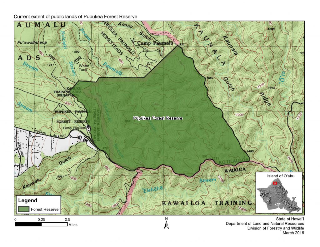 Pūpūkea Forest Reserve consists of approximately 782 acres of public land located on the north shore of Oʻahu. The reserve was established by Governor’s Proclamation in 1910 to conserve and protect the remaining forest and increase local water supply. Several non-native timber plantations were established in the reserve as part of a reforestation effort in the early 1900’s . Today, vegetation is dominated by non-native forest, although some native forest and native shrublands still exist in the southeast portion of the reserve.