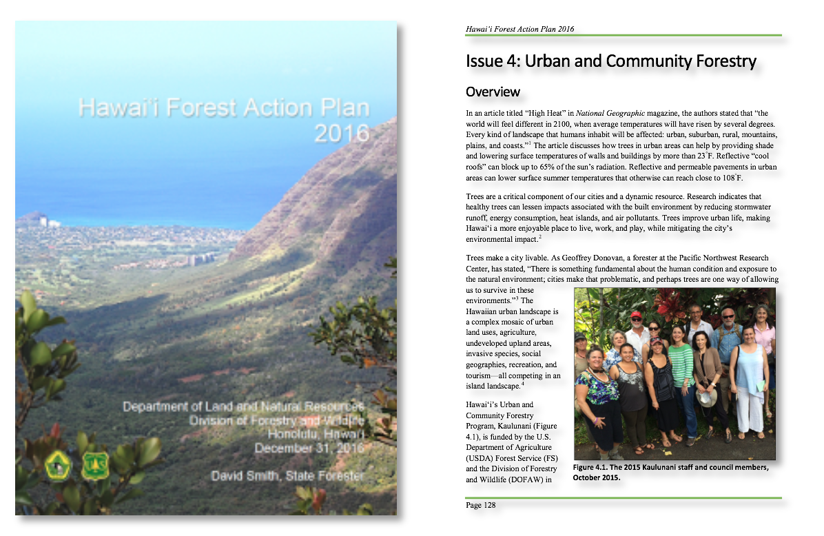 The Kaulunani Program is guided by the State’s Forest Action Plan. The Kaulunani Council worked as part of the Hawai‘i Forestry team to analyze forest-related conditions, trends, threats, and opportunities within the State, to assure that federal, state, private and community resources focus on important issues.