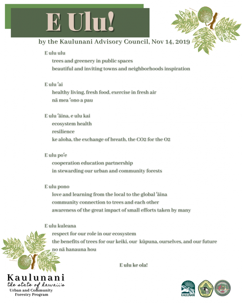 The Kaulunani Advisory Council acts in an advisory capacity to Kaulunani Urban & Community Forestry Program and the State Forestry Program. The Council provides recommendations, direction, and strategic guidance for an array of community forestry initiatives including reviewing grant applications, recommending the approval for community projects, and advising on educational and marketing initiatives. Kaulunani Advisory Council Guidelines