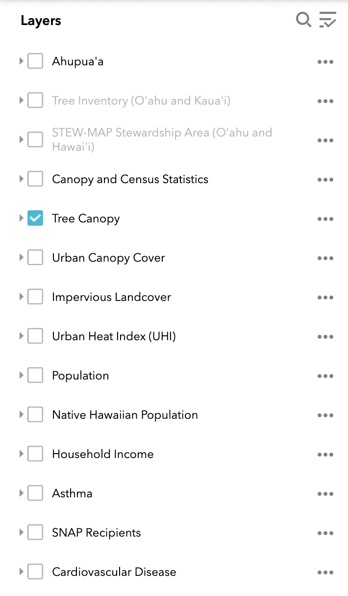 Tree Canopy Viewer Hawai‘i contains additional layers to compare with tree canopy coverage, including: