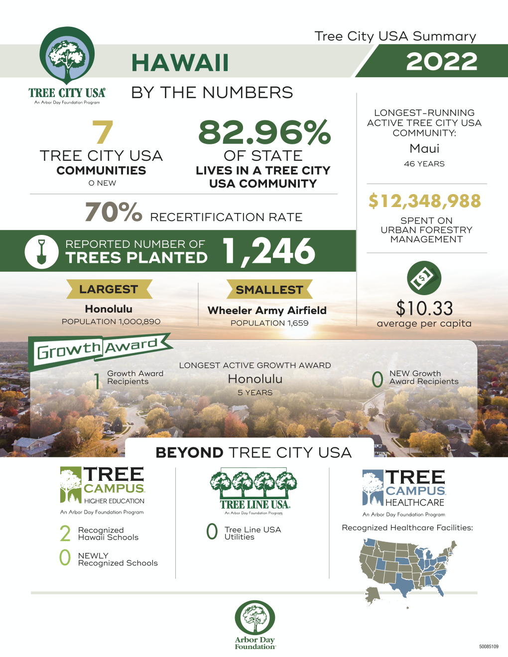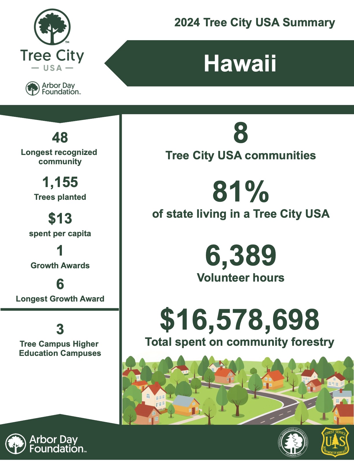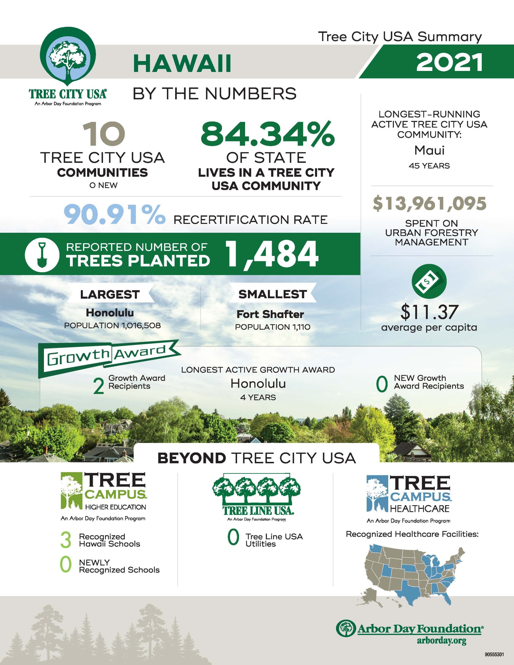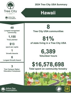 The Arbor Day Foundation’s Tree City program provides the framework necessary for communities to manage and expand their public trees.  Hawaiʻi has proudly been participating in the program since the program’s inception with our first community, County of Maui, who joined in 1976.  Participation in the program has grown since and we continue to welcome new communities each year. The following are Hawaiʻi’s current Tree City USA communities: