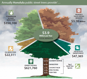 Trees cost-effectively filter and improve water quality by reducing stormwater runoff and flooding. Trees in Honolulu intercept more than 35 mil. gallons of stormwater per year. This contribution is valued at more than $350,000 annually.