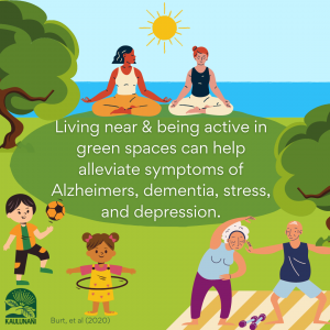 - Green spaces (particularly tree canopy) is associated with lower incidence of psychological distress (Bert & Feng, 2019).
