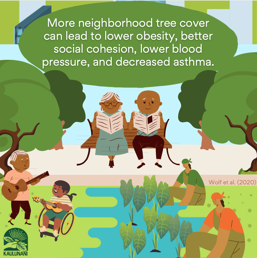 Tree-filled neighborhoods are safer, reduce mental and physical stress, and encourage people to spend more time outdoors.