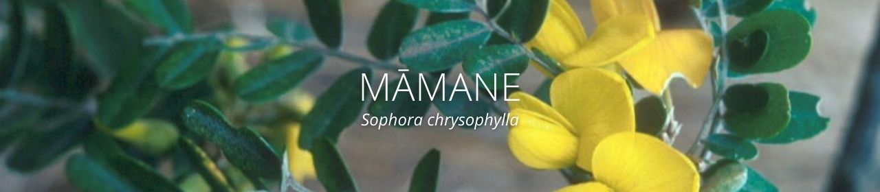 Māmane is endemic to Hawai’i and part of the Fabaceae family. It can grow in the form of a large shrub or a tree. It can reach a height of 15 m (49 ft) in tree form. The tree blooms with yellow flowers in winter and spring. Māmane plant parts are a main food source for an endangered honeycreeper on Hawaii island, the Palila (Loxiodes balleui). This species is fire tolerant, though it is not adapted to grazing by feral goats and sheep. Wood and flowers of the Māmane tree were used in many facets of early Hawaiian life. Flowers were used medicinally as an astringent and to make lei, while wood was used to construct houses, farm spades, scraping boards, and firewood. Māmane wood was also used to fashion sleds in a sport for aristocrats called hōlua. Competitors would get a running start then jump on the sled headed downhill. The person who gained the greatest distance was crowned the winner.