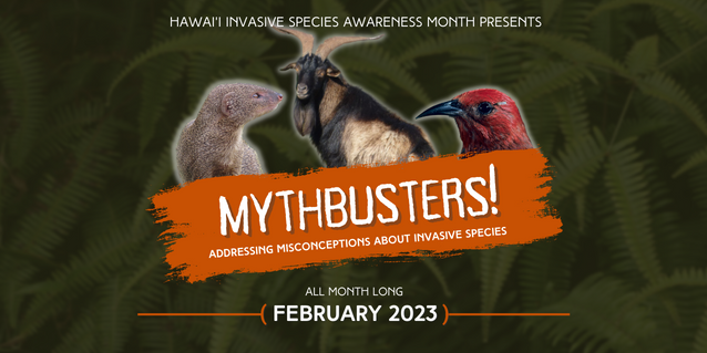 Monday, February 6th 6:00 pm – MYTHBUSTERS: Invasive Species Edition! “Nature will balance itself out.” “That can’t be invasive, it produces food!” “No one is doing anything about this weed!” Have you heard these statements in relation to invasive species? Well, we have too, and more! Tune in to learn about the myths and realities of invasive species work as our panel of invasive species experts share their perspective and some useful resources. Help us kick off 2023 Hawaii Invasive Species Awareness Month by setting the record straight and busting some myths about invasive species! Missed this talk? Check out the recording HERE.