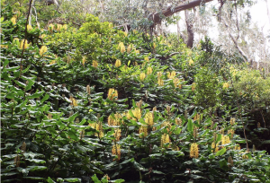 Hedychium gardnerianum overtaking a hillside. Photo Credit: Forest & Kim Starr.