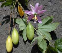 • Fast growing climbing vine. Large showy pink flowers. Produces many elongated fruit that are yellow in color when ripe. Fruit contain an orange pulp with hundreds of seeds. leaves are dark green and have three distinct lobes.