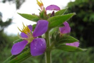 This shrub is semi woody and can grow up to 9′ tall. The young stems are angled and hairy. The leaves are opposite, 3″ long by 1.4″ wide, hairy, and have 5-7 prominent veins. The flowers are pink and have 4 petals with bright yellow anthers. The fruit is cup-like and extremely small. The seeds are very small and numerous.