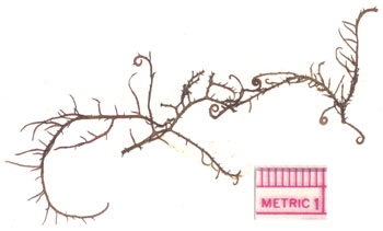 • Reddish or brownish seaweed that has enlarged curls or “hooks” at the ends of some branches, allowing it to twine around other seaweeds.