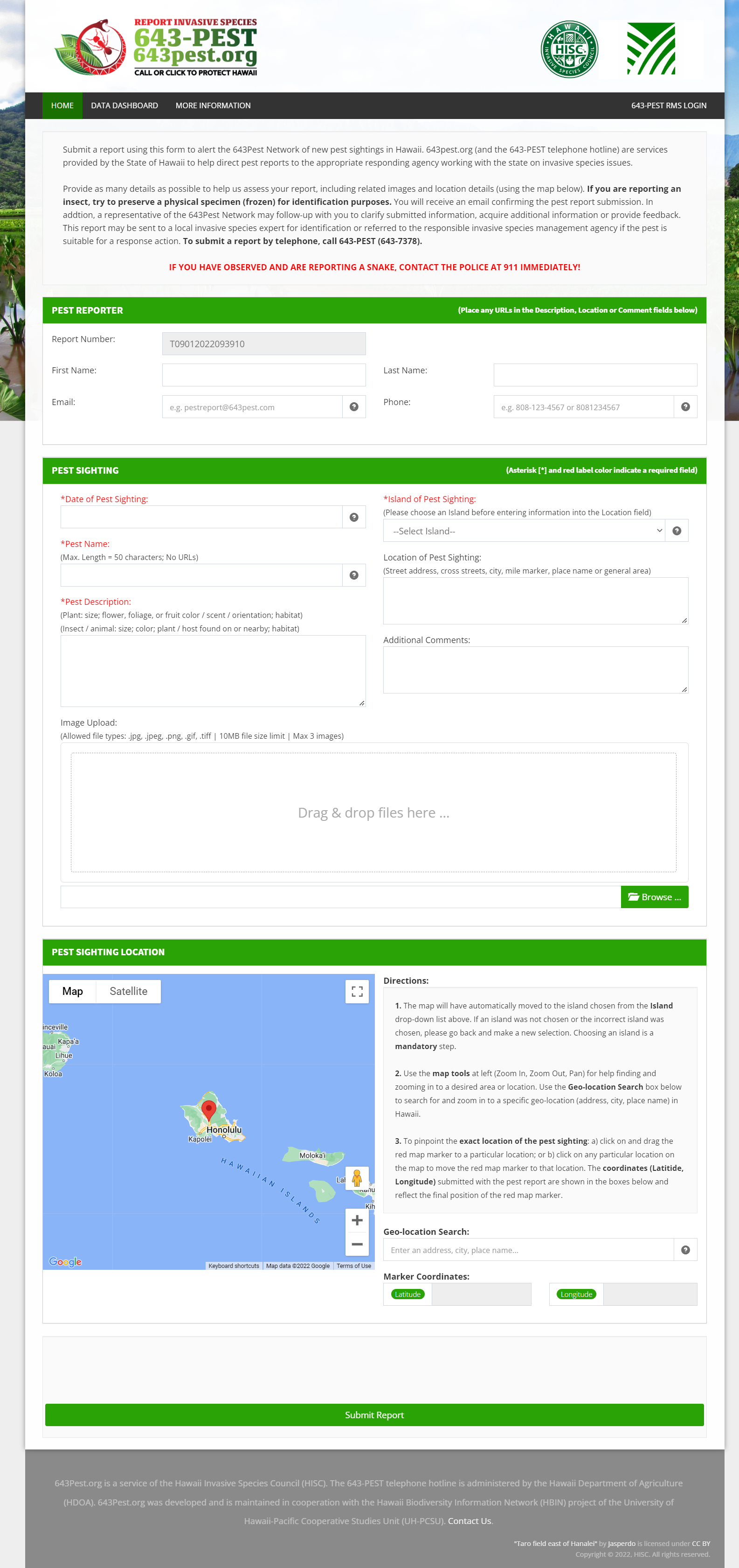 Call the statewide pest hotline, 643-PEST (808-643-7378), which will direct your to the nearest Department of Agriculture or other response agency, depending on where in the state you are calling from.