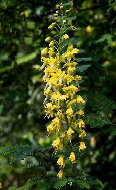 - Yellow flowers in clusters, brown pods, with 4-9 black seeds